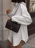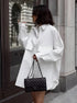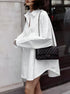 Oversizowa koszula o nowoczesnym kroju zapewnia swobodę ruchów i wyróżnia się długością sięgającą do połowy uda. Duże, naszywane kieszenie na piersiach dodają jej praktycznego charakteru, a klasyczny kołnierzyk i zapięcie na guziki podkreślają elegancką formę. Subtelne pionowe paski wprowadzają lekkość i optycznie wydłużają sylwetkę, dzięki czemu koszula sprawdzi się zarówno na co dzień, jak i na bardziej formalne okazje.